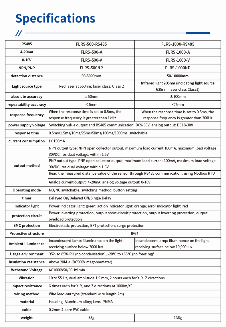 Construida con protección multicapa, incluida protección electrostática, EFT y sobretensiones, la serie FLRS protege su equipo y mejora la seguridad operativa. Su diseño compacto e integrado de medición y control minimiza los requisitos de espacio y reduce la complejidad del cableado, ofreciendo eficiencia y facilidad de instalación. Elija entre modelos como FLRS-1000-RS485 (50–10 000 mm) o FLRS-500-RS485 (50–5000 mm) para satisfacer sus requisitos de rango específicos.